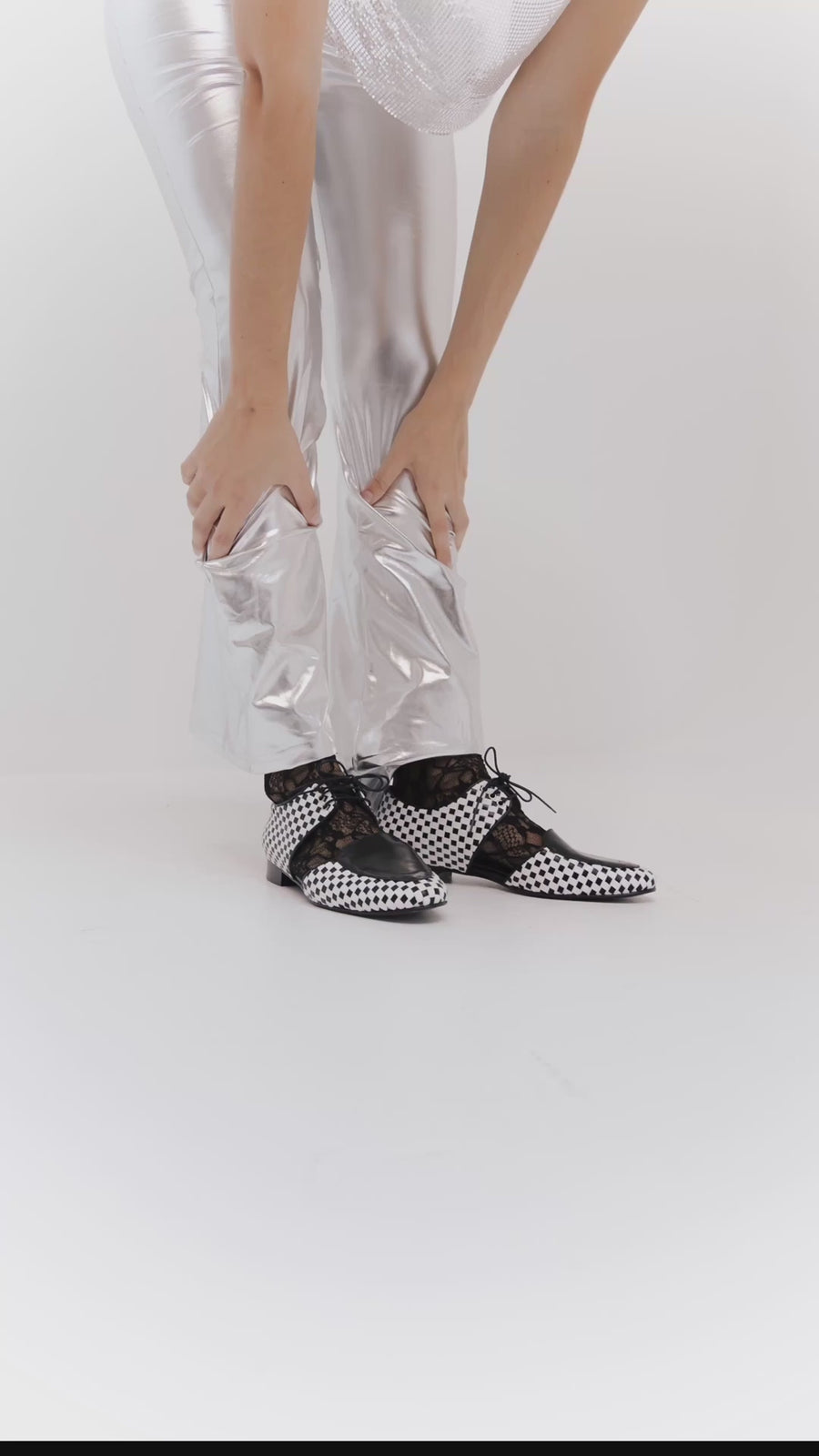RECOMENDAMOS COMPRAR UNA TALLA MÁS GRANDE DE LO HABITUAL. Mocasín en cuero trenzado blanco y negro y copete en vacuno negro. Suela de cuero negra y cordones negros. Fabricado en Petrel, Alicante por los hermanos Rico.