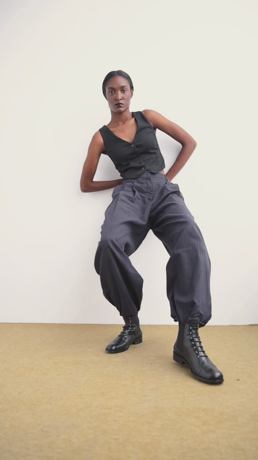 Bota Chelsea con cordonera fija en becerro negro. Suela de cuero negra y forro beige. Tacón de 2´5cm. Fabricada en Petrel, Alicante por los hermanos Rico.