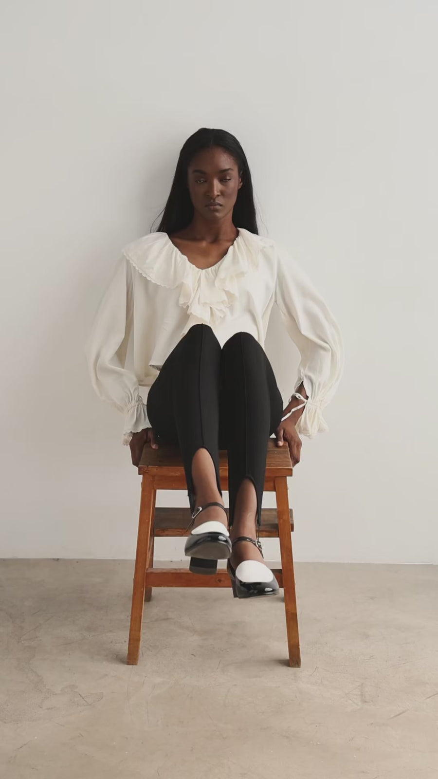 Mary-jane mezclado con mocasín con copete en charol blanco y negro. Tacón de 4cm forrado en suela negra. Forro beige y suela de cuero negra. Fabricado en Petrel, Alicante por los hermanos Rico.