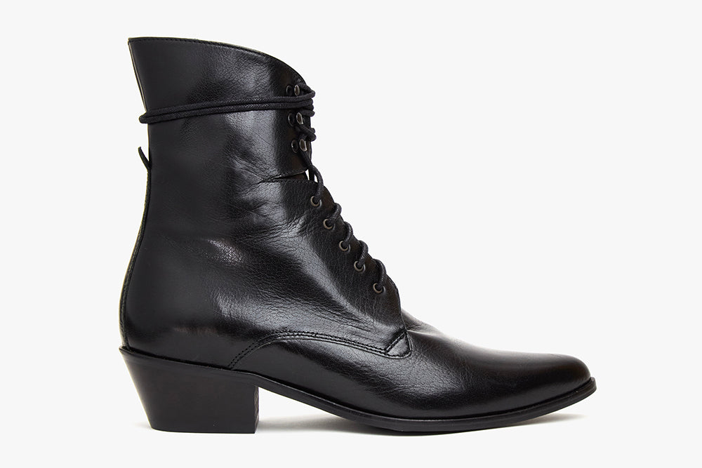 Bota de cordones en piel vacuno de pelo con estampado de leopardo y tacón cubano de 5 cm. Caña de 16cm aproximadamente. Suela de cuero con inyección de goma. Es una bota que talla fiel al número y tiene una horma holgada.