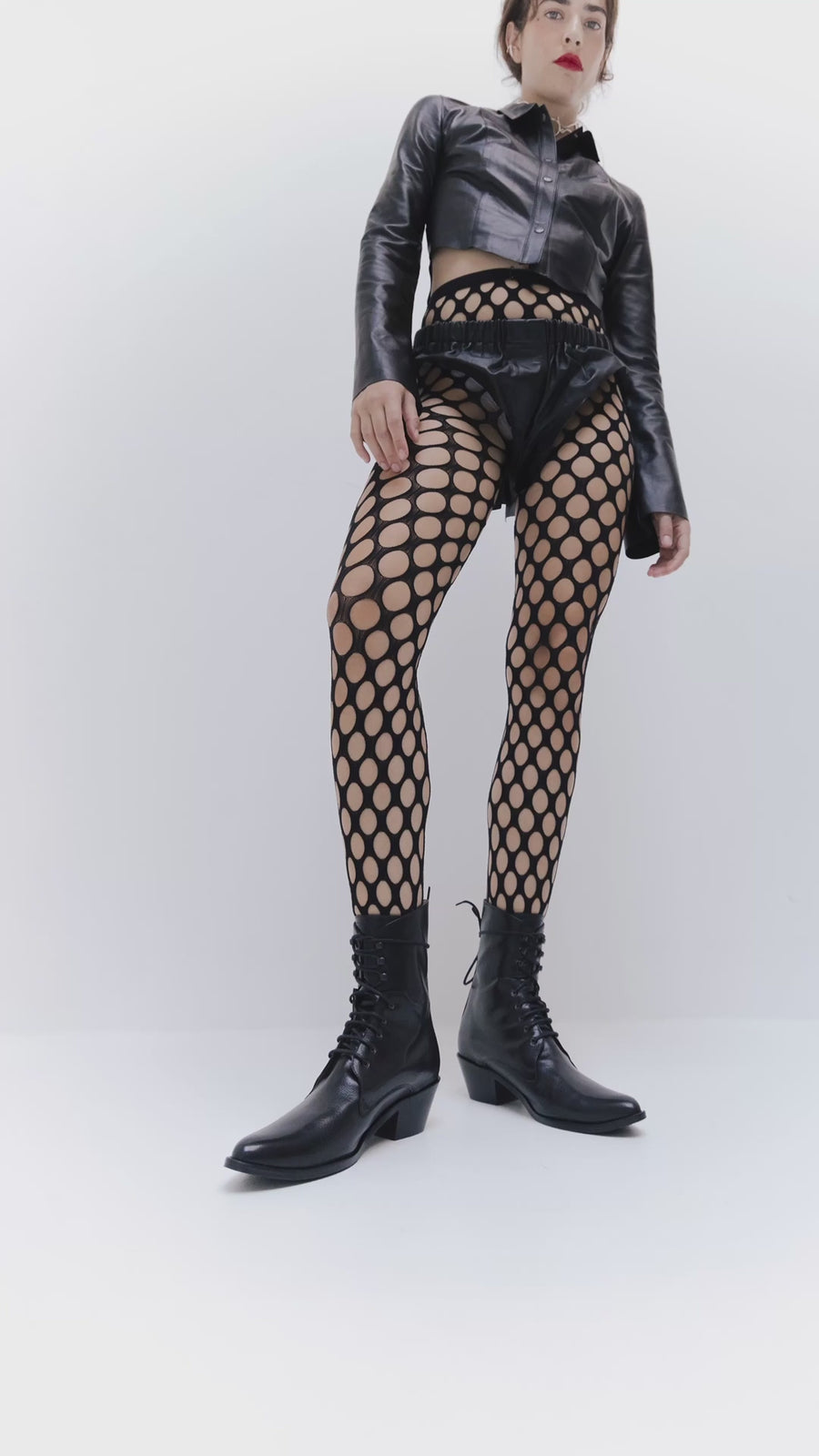 Bota con cordones en becerro negro con tacón cubano de 5 cm. Caña de 16cm aproximadamente. Suela de cuero con inyección de goma. Es una bota que talla fiel al número y tiene una horma holgada. Es una de nuestras botas favoritas.