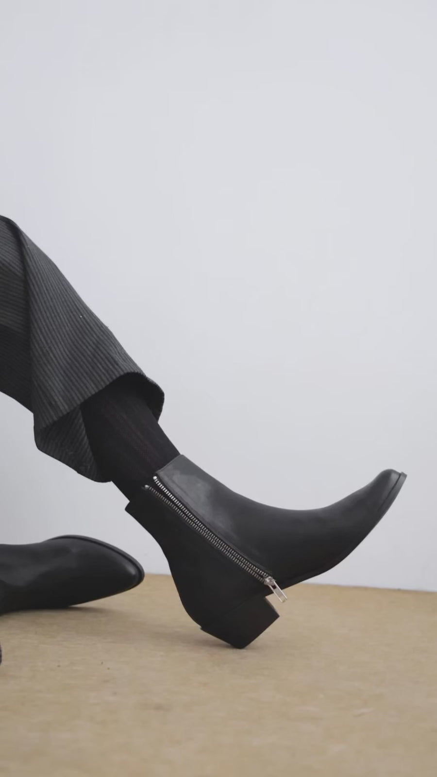 Bota en piel granulada negra, tacón cubano de 4´5cm y cremallera metálica. Suela de cuero negra y forro de cabra beige. Fabricado en Petrel, Alicante por los hermanos Rico.
